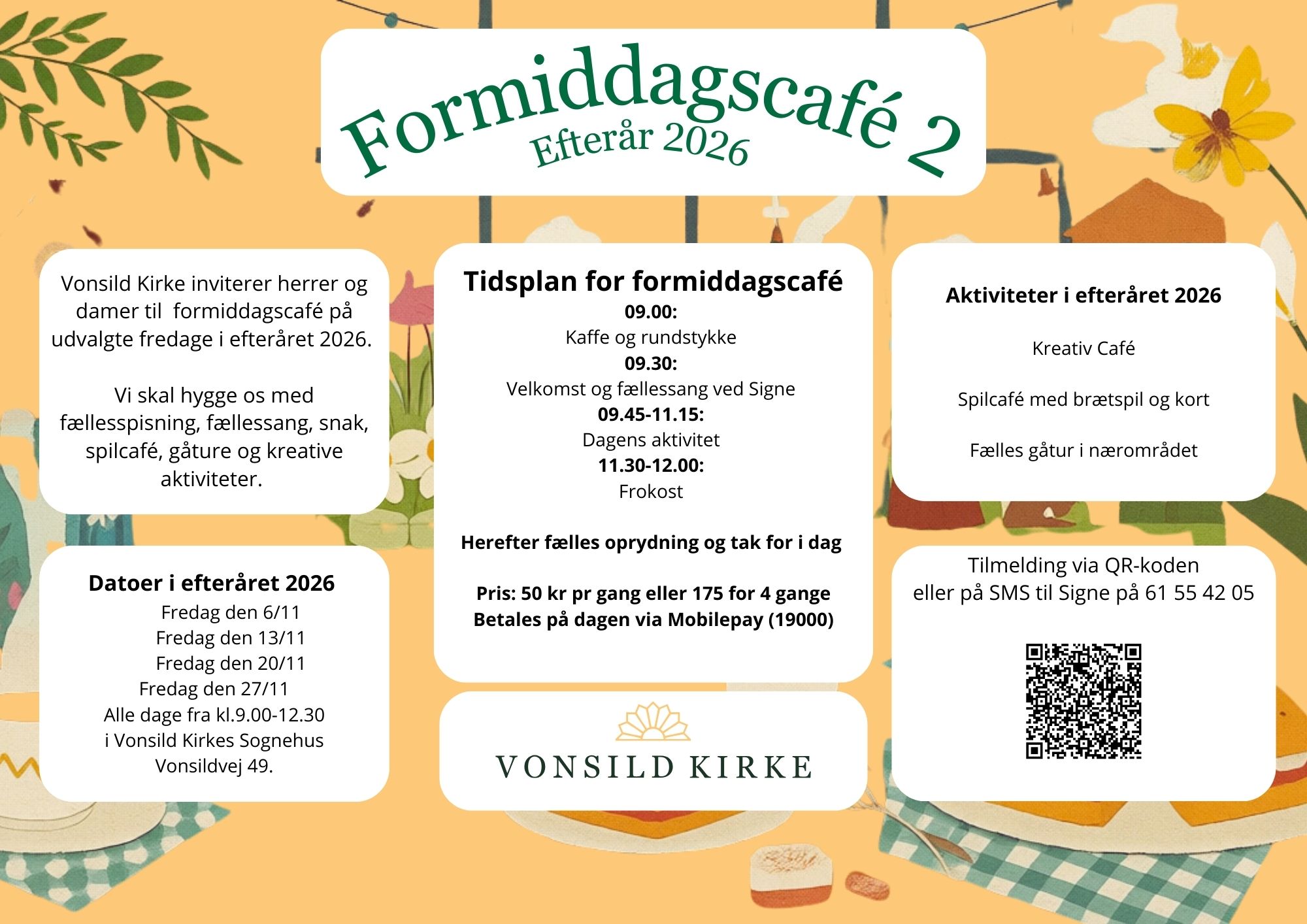 I efteråret 2026 gentager vi succesen og inviterer atter til Formiddagscafé. Denne gang bliver det i november måned og det er allerede muligt at melde sig til og skrive datoerne i kalenderen.
