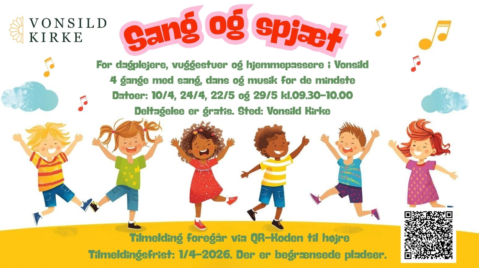 Sang og Spjæt er et gratis tilbud til alle dagplejere, hjemmepassere og vuggestuer i Vonsild. Her mødes vi i kirken til en hyggelig formiddag med sang, musik og bevægelse for de mindste og deres voksne.
